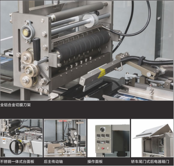 3.本機(jī)采用全鋁合金切膜刀架、單旋轉(zhuǎn)切膜刀,切膜精確、平整,大小產(chǎn)品無需更換切膜機(jī)構(gòu)。